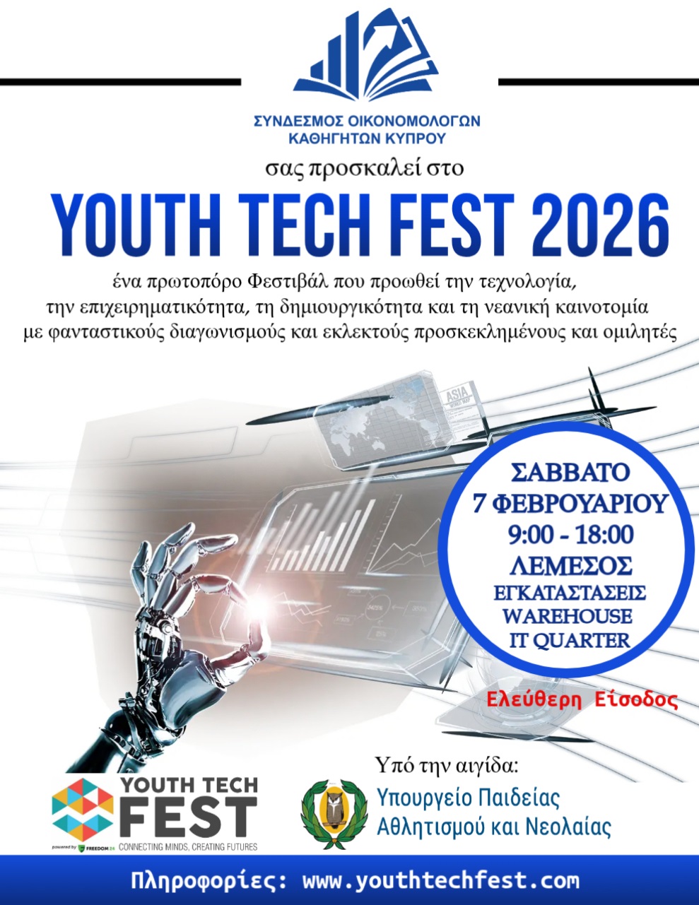 Ως Σύνδεσμος Οικονομολόγων Καθηγητών Κύπρου, υποστηρίζουμε ενεργά το Youth Tech Fest που θα πραγματοποιηθεί για τέταρτη συνεχή χρονιά στην Κύπρο, καθώς αποτελεί μια σημαντική εκπαιδευτική και καινοτόμο δράση για τη νέα γενιά. Το Φεστιβάλ θα πραγματοποιηθεί στις 7 Φεβρουαρίου 2026, στη Λεμεσό 9:00-18:00 στις εγκαταστάσεις Warehouse by IT Quarter. Το Φεστιβάλ δίνει την ευκαιρία στους μαθητές μας να έρθουν σε επαφή με σύγχρονες τεχνολογίες, την ψηφιακή επιχειρηματικότητα, τη νεοφυή καινοτομία και τις δεξιότητες του μέλλοντος. Μέσα από εργαστήρια, παρουσιάσεις και διαδραστικές δραστηριότητες, οι μαθητές ενισχύουν την κριτική σκέψη, τη δημιουργικότητα και την οικονομική τους αντίληψη, ενώ αποκτούν πολύτιμα ερεθίσματα για τις σπουδές και την επαγγελματική τους πορεία!